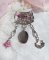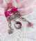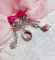 J’ai appliqué des cabochons ronds dans les nuances de Crystal AB et Fuchsia Cristal Swarovski à laquelle s’ajoute des pendants avec une clochette Rose Pink verre, une breloque charme en forme de fleur, un pendentif ovale verre représentant un visage de femme aux cheveux longs bouclés portant un bouquet de roses, des intercalaires gouttes métal, une toupie Opaque Rose Argenté et coupelles filigranées